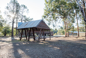 The three bay Gantry is an open sided structure with a corrugated iron roof. On the southern side of the structure a set of three, A-frame bush poles support the roof and two sets of hoist equipment. On the northern side the structure is supported by square sawn posts. The place has an earth floor.