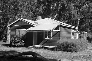In plan the cottages include a living room (with open fire), two bedrooms, kitchen (with wood stove), and a bathroom off the rear verandah.