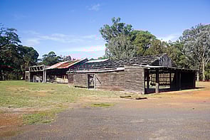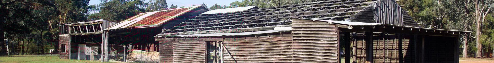 This building comprises a collection of largely open-sided structures in three attached units, with lean-tos. The building is framed by bush poles (some roughly squared) and has a gabled roof, variously clad with corrugated asbestos and corrugated iron. Where partly enclosed, the walls are clad with square sawn weatherboards. The floors are primarily earth, with small sections of concrete or timber.