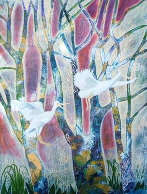 Artist: Jean StasseDescription: Abstract Realism. Two white spoonbills rise from a creek just before dawnMedium: Acrylic on canvasSize: 76 cm (W) x 100 cm (H)