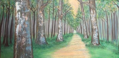 Artist: Sandra MotteramDescription: Tuart trees stand tall, towering over a sea of Peppy`s and Pines.Medium: Acrylic on canvasSize: 100 cm (W) x 50 cm (H)