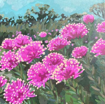 Artist: Jaye LamondDescription: Natural landscape with purple blossomsMedium: Acrylic on canvasSize: 25 cm (W) x 25 cm (H)