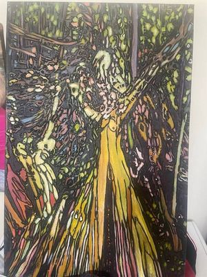 Description: The Conversation is Real depicts an encounter between forest beings in the liminal space between form and field. One cloaked in yellow rises like a mother tree, while another leans toward her from the dark  both figures shaped by bark-like textures, root