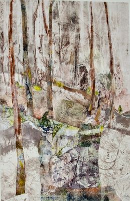 Artist: Margaret CoyDescription: Memories of walking in the Dryandra WoodlandsMedium: Monoprint/collageSize: 80 cm (W) x 109 cm (H)