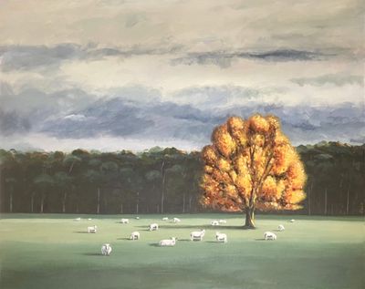 Artist: Ian PaveyDescription: A tree near Margaret River in golden autumn colours with sheep grazing in the foregroundMedium: Acrylic on boardSize: 51 cm (W) x 41 cm (H)