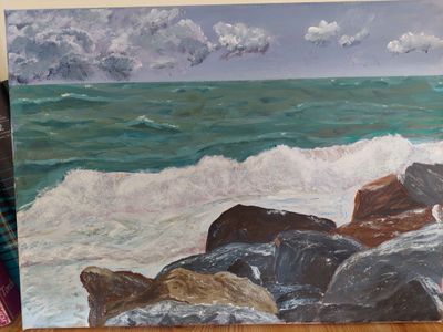 Artist: Linda HarrisDescription: Looking out to sea from a rocky shoreMedium: Acrylic on canvasSize: 40 cm (W) x 30 cm (H)