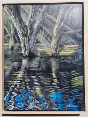 Description: This narrow wetland corridor in Vasse, part of Wadandi Boodja. Located near Oaks Drive, is a place people walk past every day, watching it change with the seasons. Listening to the chorus of birds that inhabit the area.