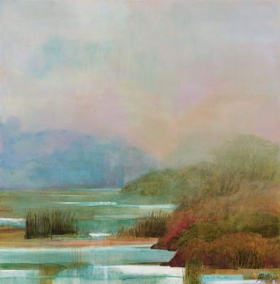 Description: This is a painting that encapsulates place, my morning walks that connect me to the land I live on. Layers of tinted glazes capture moments of morning mist, the way light becomes opalescent, colours change the landscapes softens