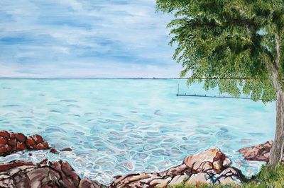 Description: This painting is a special place in my local neighborhood, where I walk most mornings. It is viewed from the familiar grass lined banks surrounding the popular Fish Rock and local boat ramp at Old Dunsborough. The morning light that glows over granite r