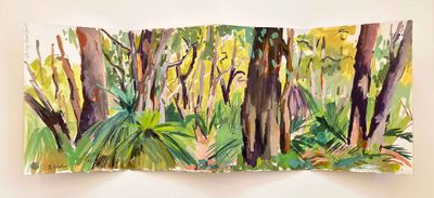 Medium: Painted en plein air whilst seated at ground level this piece records my immediate response to the beautiful chaos of the mixed Jarrah, Marri Forest. Representing the duration in time over which it was painted rather than a snapshot, the painting incorporates the shifting changes of light and shadow. The accordion format serves as a convenient fold up sketchbook when out in the field and when on display, opens up as a piece with 3 dimensional qualities, each fold accentuating the feeling of being enveloped and immersed in the natural world.