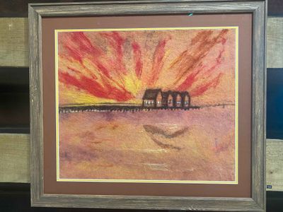 Description: I have tried to capture the colours of a spectacular sunset behind the Busselton Jetty, Using a wet felting technique I created the background felt then using a dry needle technigue I have added the detail to create the Jetty image.