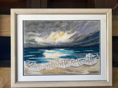 Description: Using a wet and dry needle felting techniques to create a storm rolling in from the ocean, I have used lace to create the impressions of waves breaking on the shore.