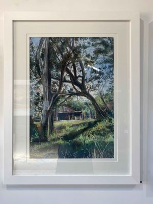 Artist: Kate HolmesDescription: View of an old farm shed through shadowed forestMedium: PastelSize: 62 cm (W) x 78 cm (H)