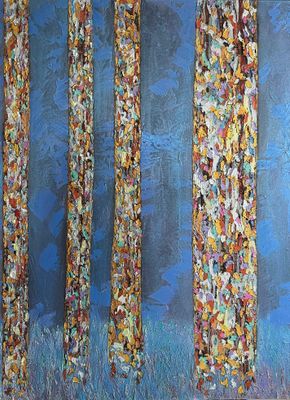 Description: Karri Trees is an abstract work painted on canvas with metallic acrylic paint with added thick medium s and sand to enhance the reflective paints. This work represents the unique Karri Forest of the South West of Western Australia.