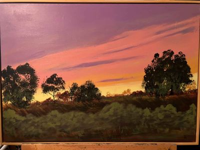 Artist: Irene StephensDescription: Autumn sunset full of vivid colours softly lighting the foregroundMedium: Acrylic on canvasSize: 70 cm (W) x 50 cm (H)
