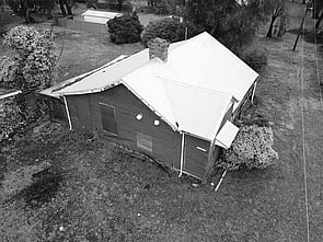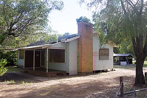 The floor plan comprises a simple rectangle with a living room, three bedrooms, kitchen, bathroom, laundry and toilet all under the main roof. The front porch extends forward from the main part of the house, is supported by simple square sawn posts, and has a raised concrete floor.