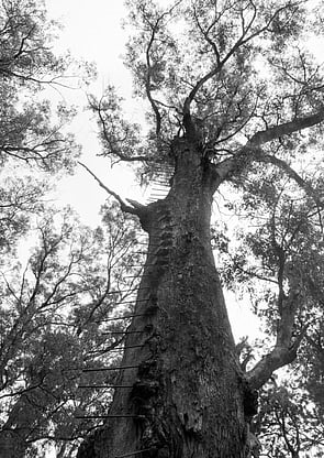 The fire lookout tree was spared from the axe or mattock during clearing for agriculture due to its size and condition. It is estimated this tree has survived some 500 years to reach its present size.